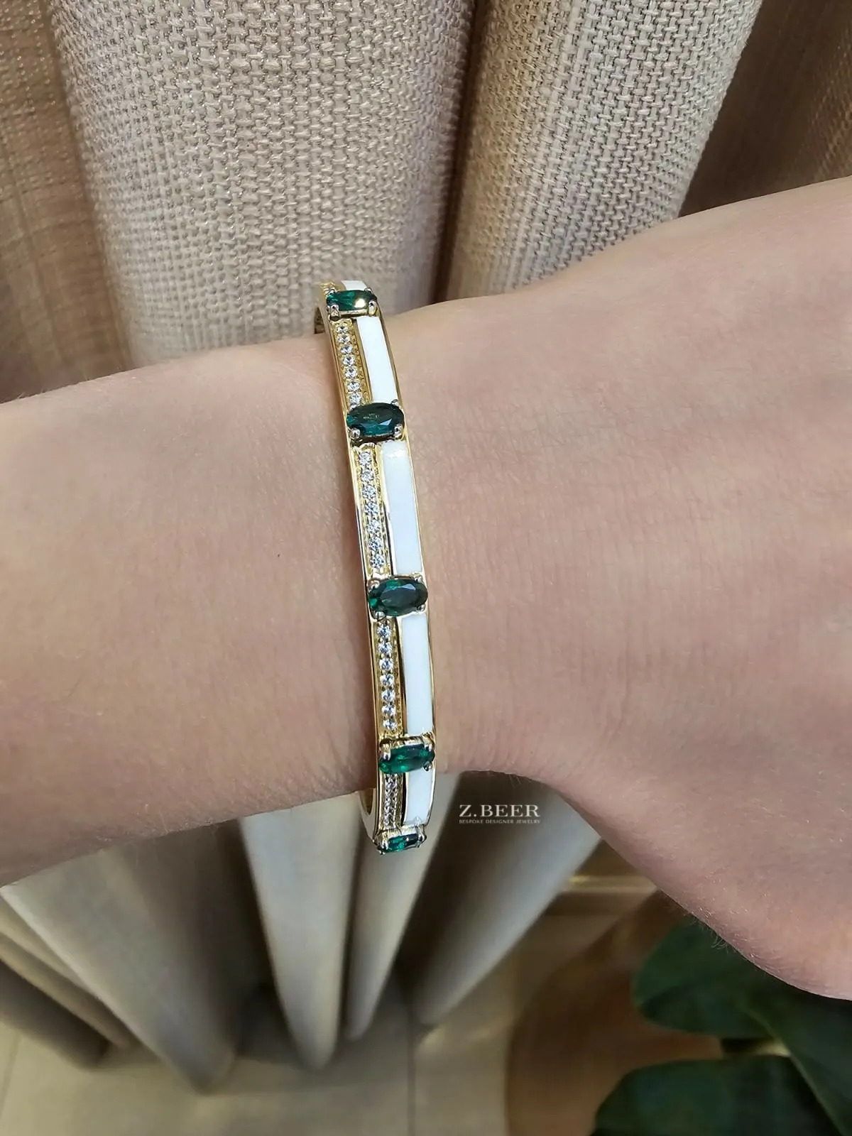 Bangle bracelet in 14K yellow gold, set with emeralds and brilliant-cut round diamonds for a total of around 1.10 carat.