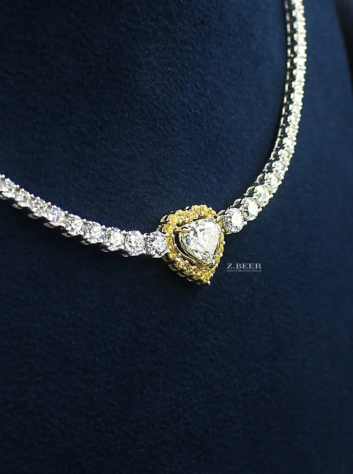 Diamond necklace, in 14K yellow and white gold, set with 0.88ct yellow stones, 1.79 carat heart shaped diamond, brilliant-cut round diamonds, for a total of around 6.77 carat.
