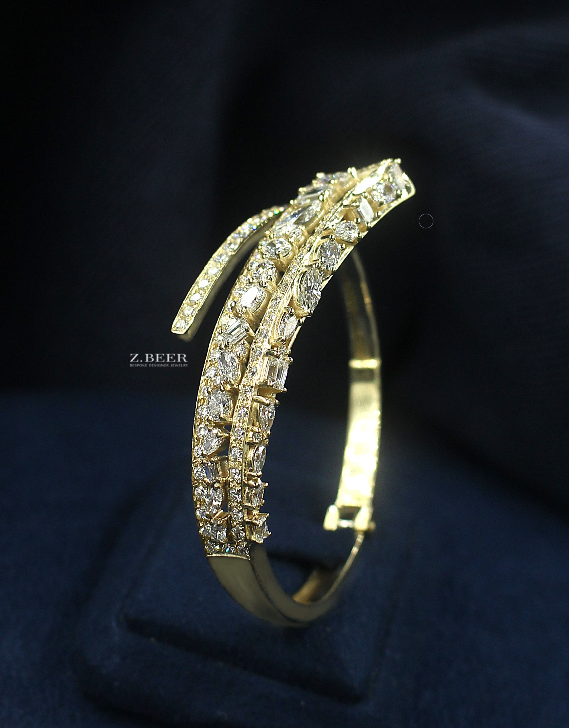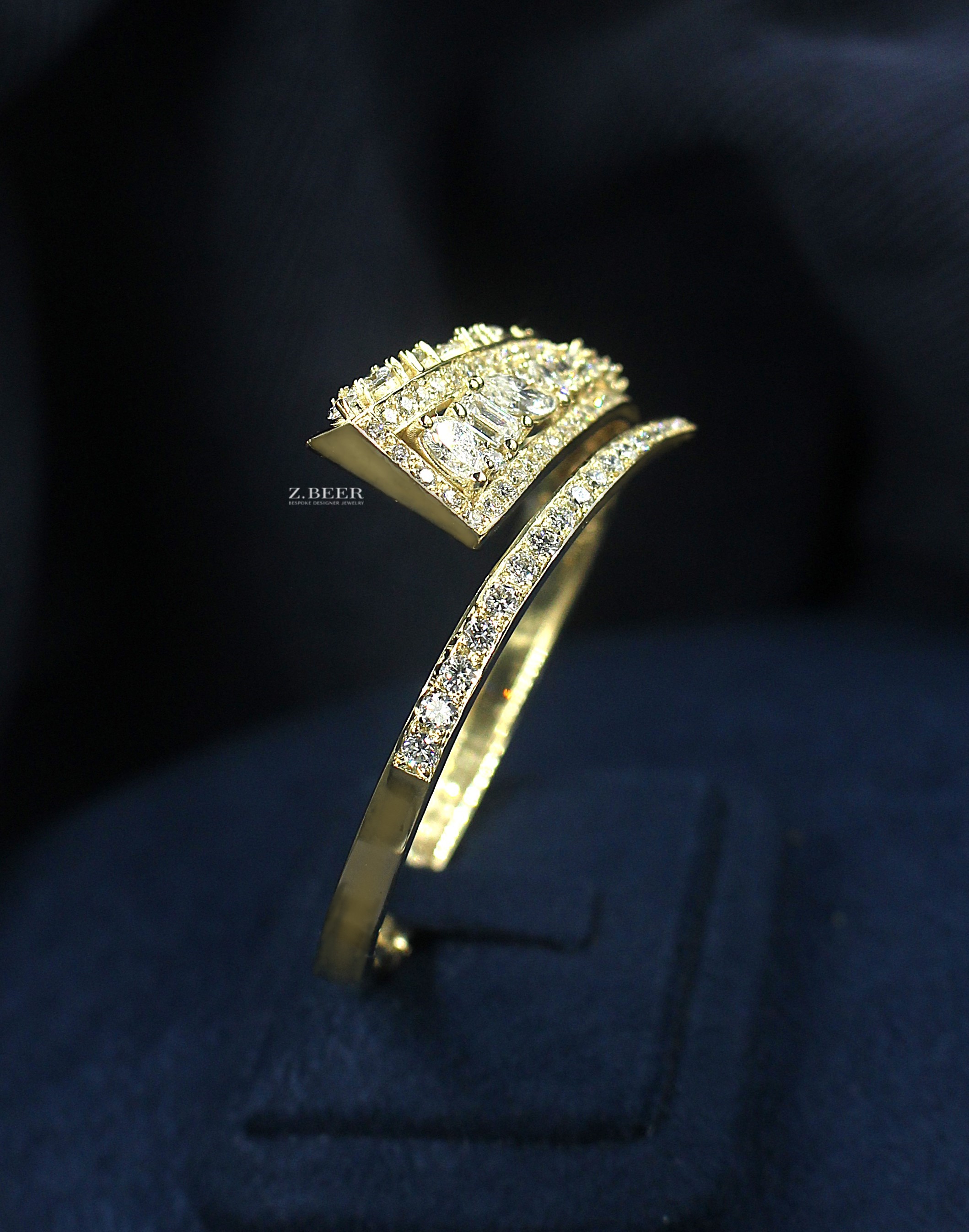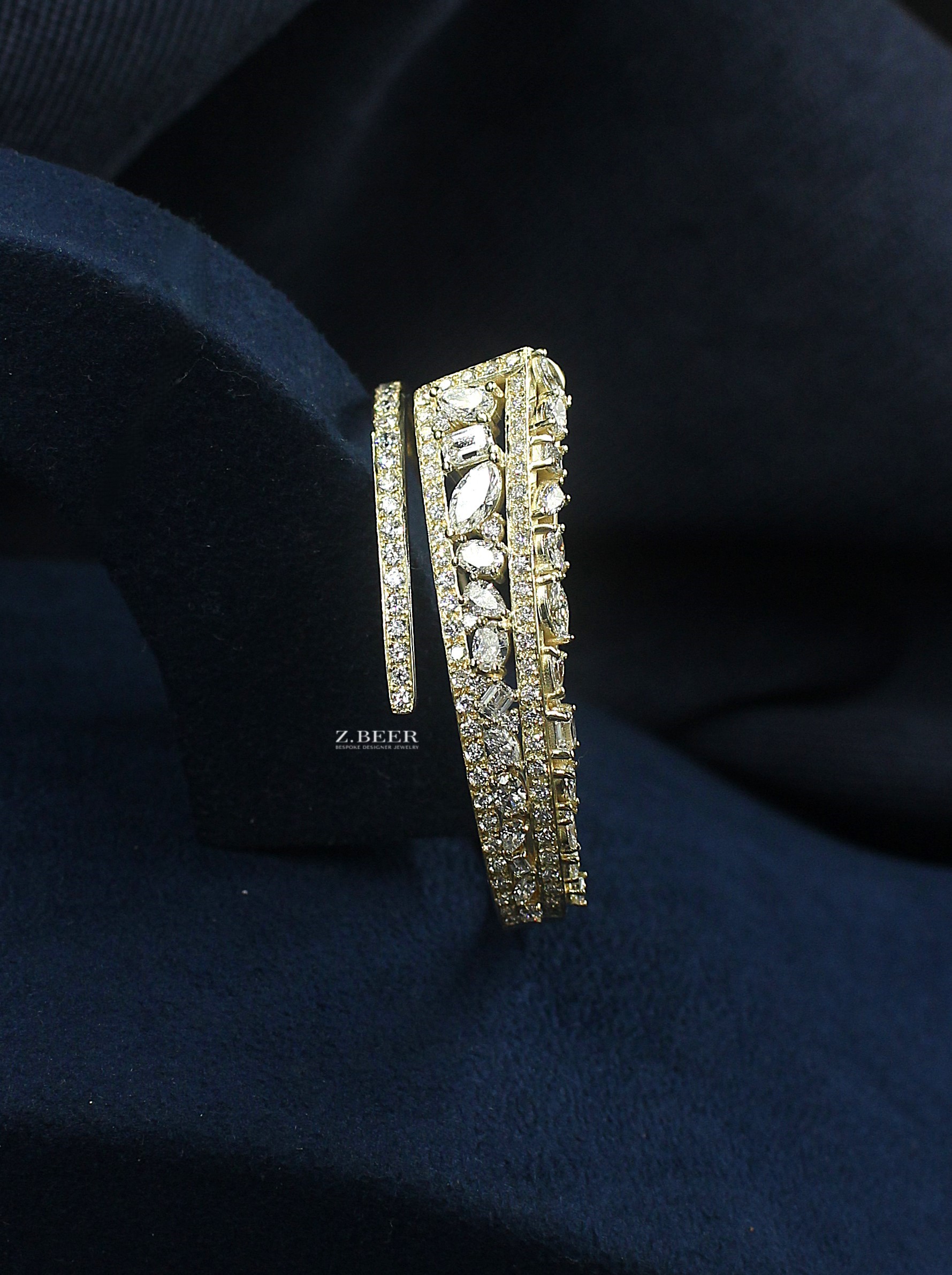 Diamond bangle bracelet, in 14K yellow gold, set with marquise, pear shape, emerald, oval and round diamonds, for a total of around 6.28 carat.