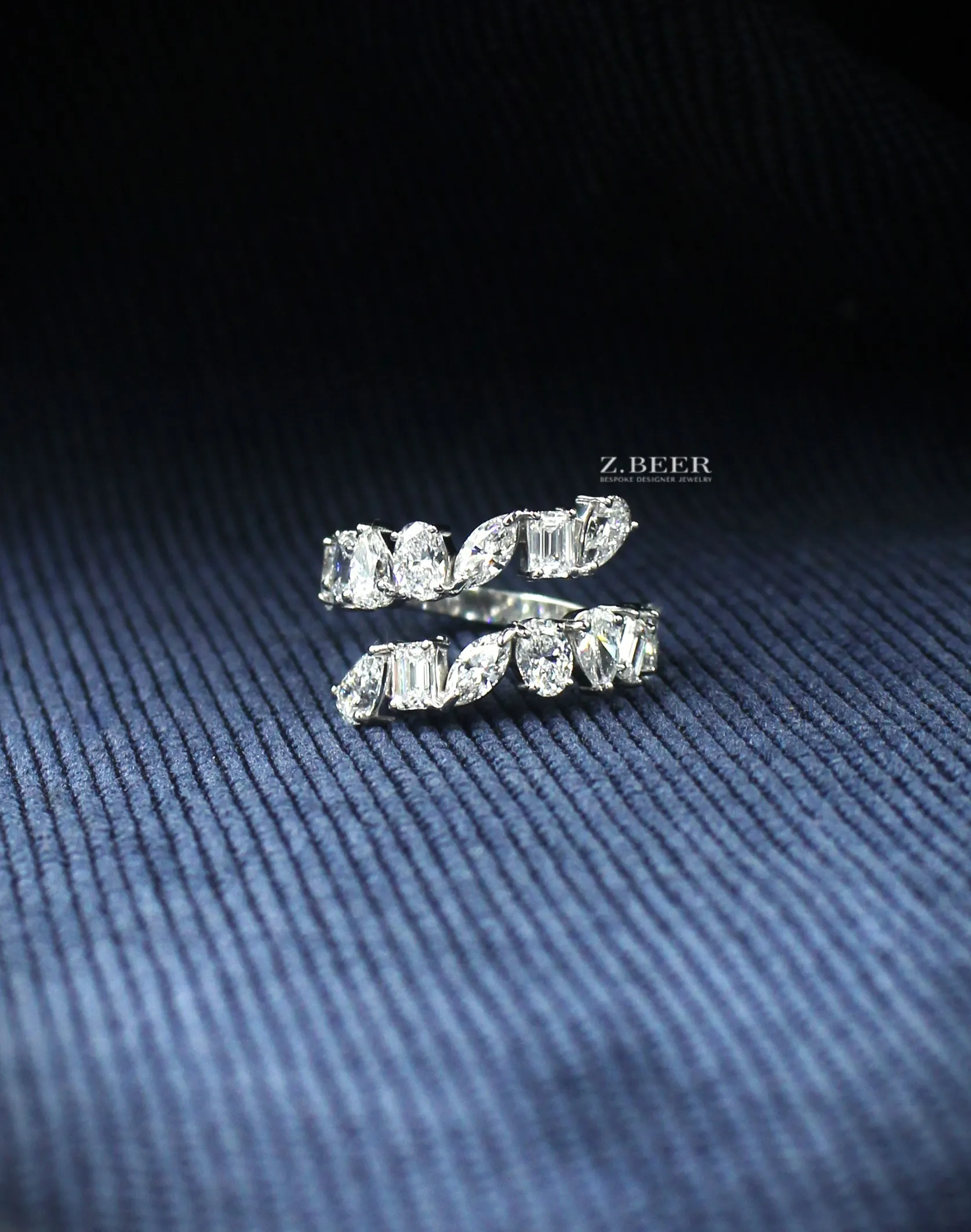 Spiral ring in 14k white gold, set with marquise, pear shaped, emerald cut and brilliant-cut diamonds for a total of around 3.63 carat.